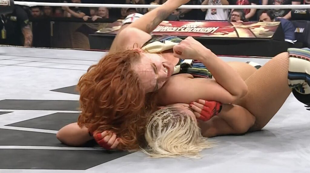 El combate continuó con intercambios intensos: Thekla conectó un potente golpe a la mandíbula de Hayter y aplicó su llave Spiders Web, pero Hayter logró tocar la cuerda para romper la sumisión. Más tarde, Hayter aplicó un backbreaker, mientras que Thekla respondió con un spear, ambas logrando solo conteos parciales.