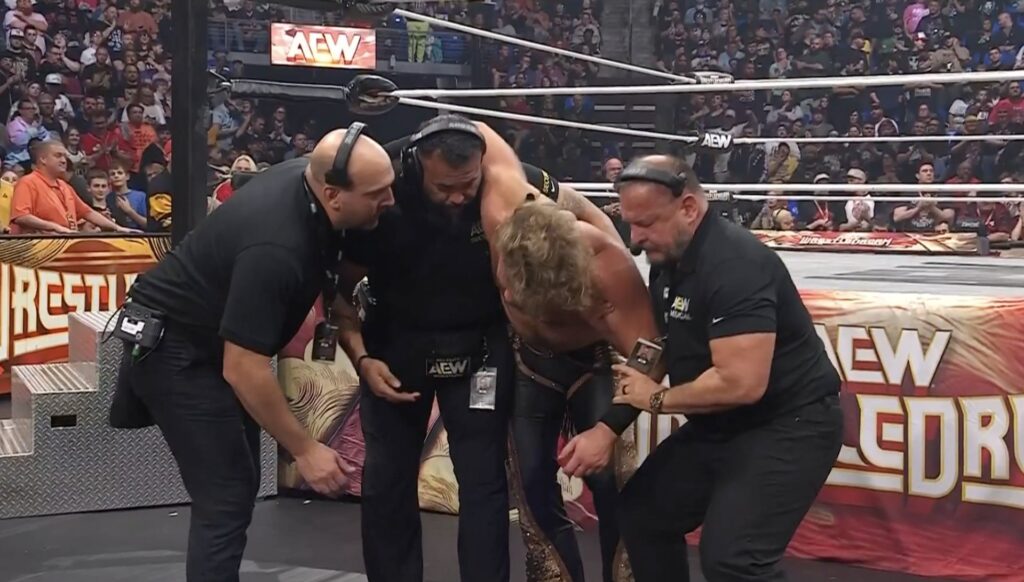 Dentro del ring, ambos intercambiaron codazos y chops hasta que Allin conectó un Code Red y colgó a Moxley con la bandera de AEW. Jon reaccionó, pero Allin se recuperó y roció líquido inflamable en sus ojos, distrayendo a Wheeler Yuta y Daniel García. Moxley logró conectar un Cutter, y PAC y Claudio Castagnoli le pasaron una toalla para limpiarse.
