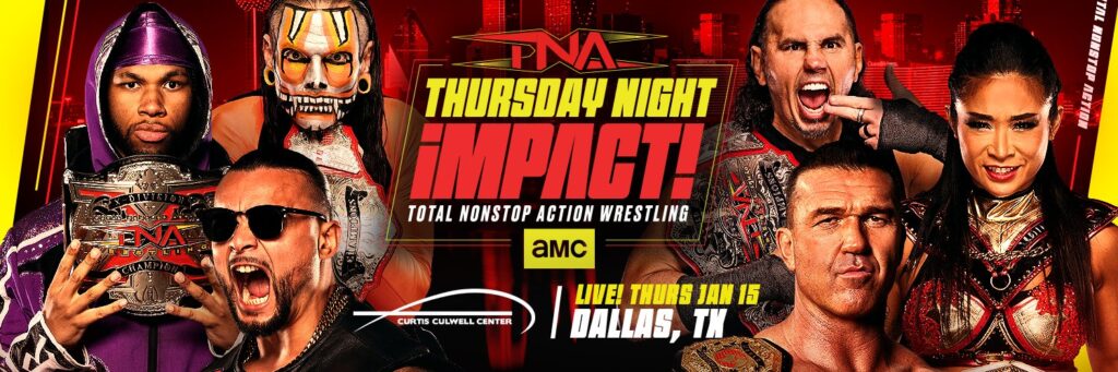 TNA Wrestling ha confirmado grandes combates para la cartelera del episodio del 15 de enero de 2026 de TNA iMPACT, en vivo desde el Curtis Culwell Center, en Dallas, Texas. Este show marcará el episodio estreno de TNA en su nuevo hogar televisivo, AMC, así como en su plataforma AMC+, bajo el nombre “Thursday Night iMPACT!”.