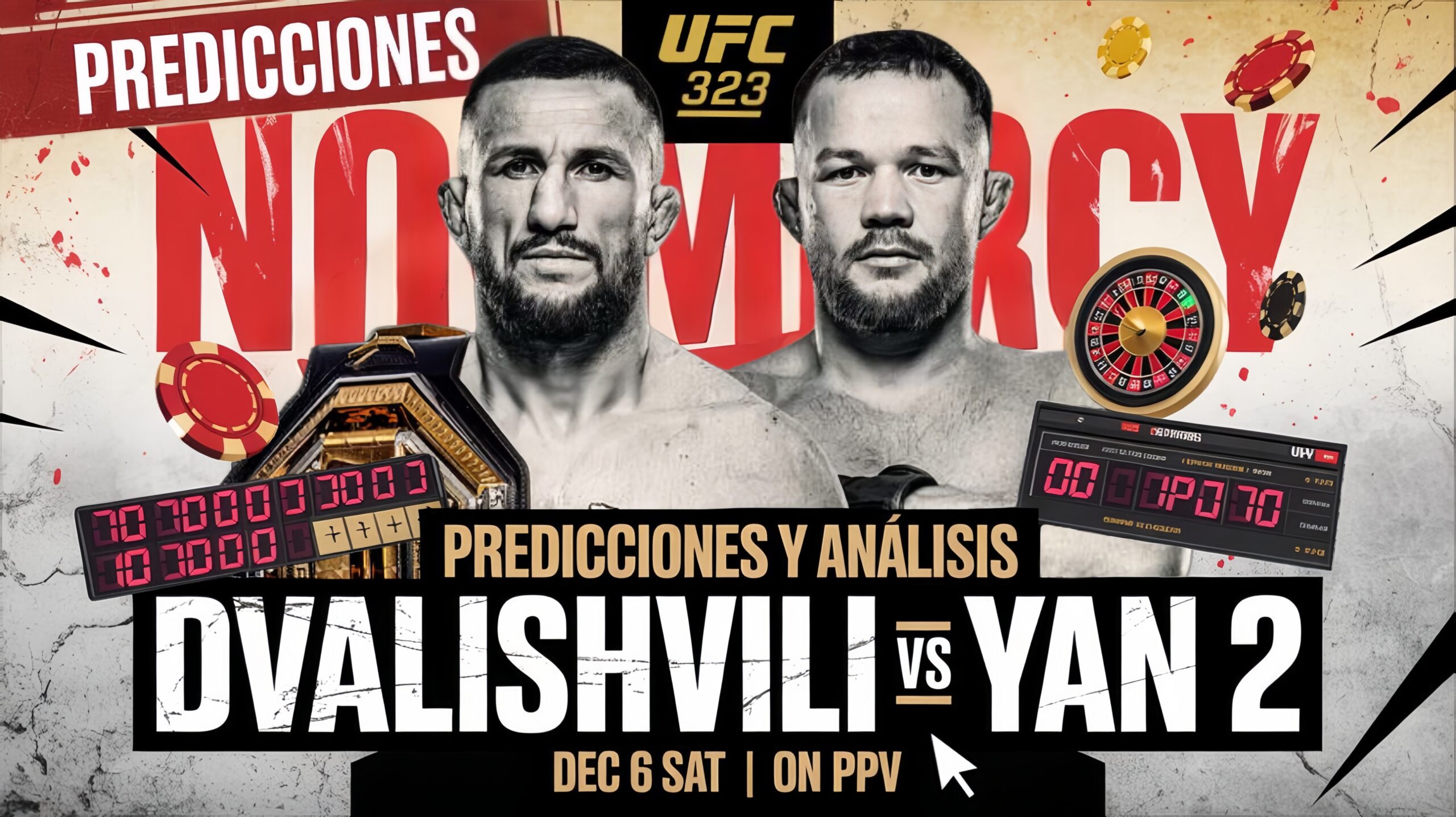 Descubre las predicciones y el análisis de cada pelea de UFC 323: Dvalishvili vs. Yan 2, el último evento numerado del año, que se celebrará el 6 de diciembre de 2025 en el T-Mobile Arena de Las Vegas. Infórmate sobre los favoritos según las casas de apuestas, sus rachas recientes, los peleadores con mayor probabilidad de victoria y los métodos de triunfo más probables. Además, conoce las predicciones más confiables, los parlays recomendados y las apuestas más seguras para obtener ganancias y proteger tu dinero.