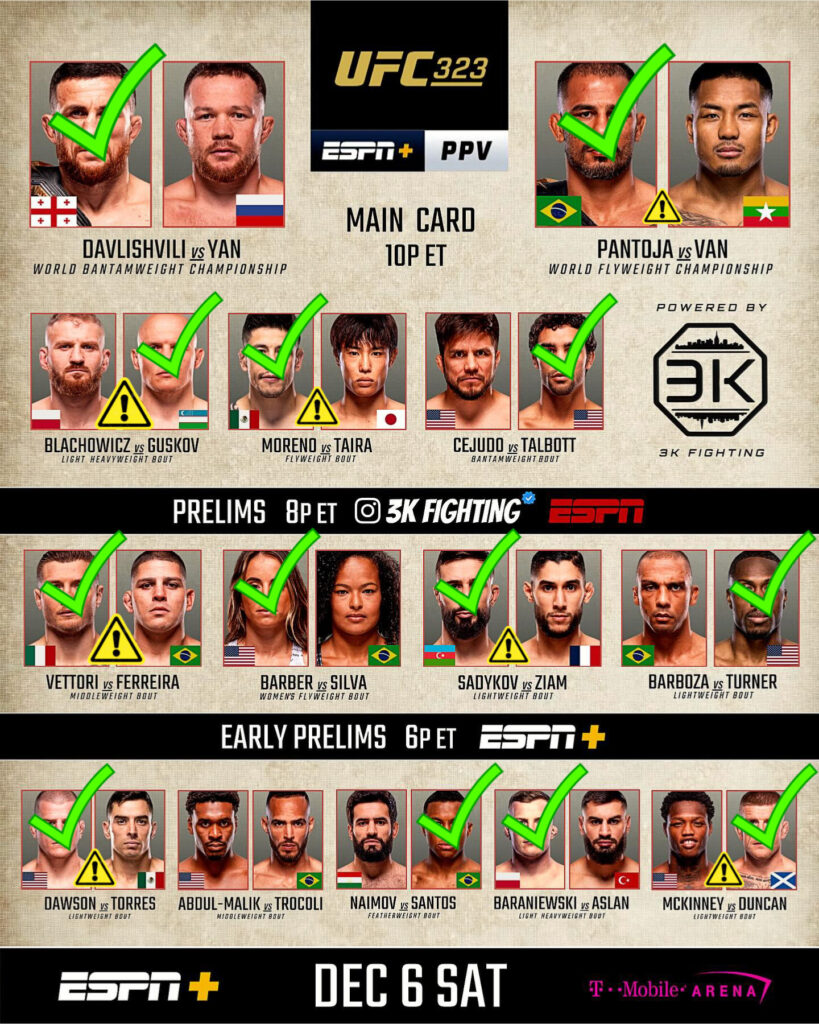 - Jan Blachowicz (29-11-1): Viene de una derrota ante Carlos Ulberg; ha perdido sus últimas tres peleas ante rivales de élite. Registra 18 finalizaciones: 9 por KO y 9 por sumisión.