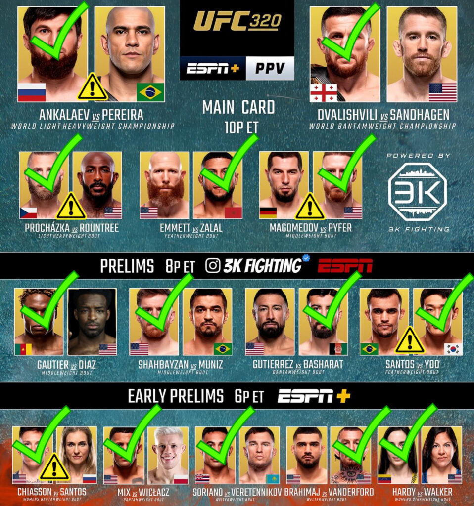 Predicciones y análisis de cada pelea del UFC 320: Ankalaev vs. Pereira, programado para el sábado 4 de octubre de 2025. Incluye detalles sobre los estilos de los peleadores, sus rachas recientes, los métodos de victoria más probables, los favoritos según las casas de apuestas, las predicciones más confiables, además de recomendaciones de parlays más seguros para apostar, obtener ganancias y proteger tu dinero 💰💵.