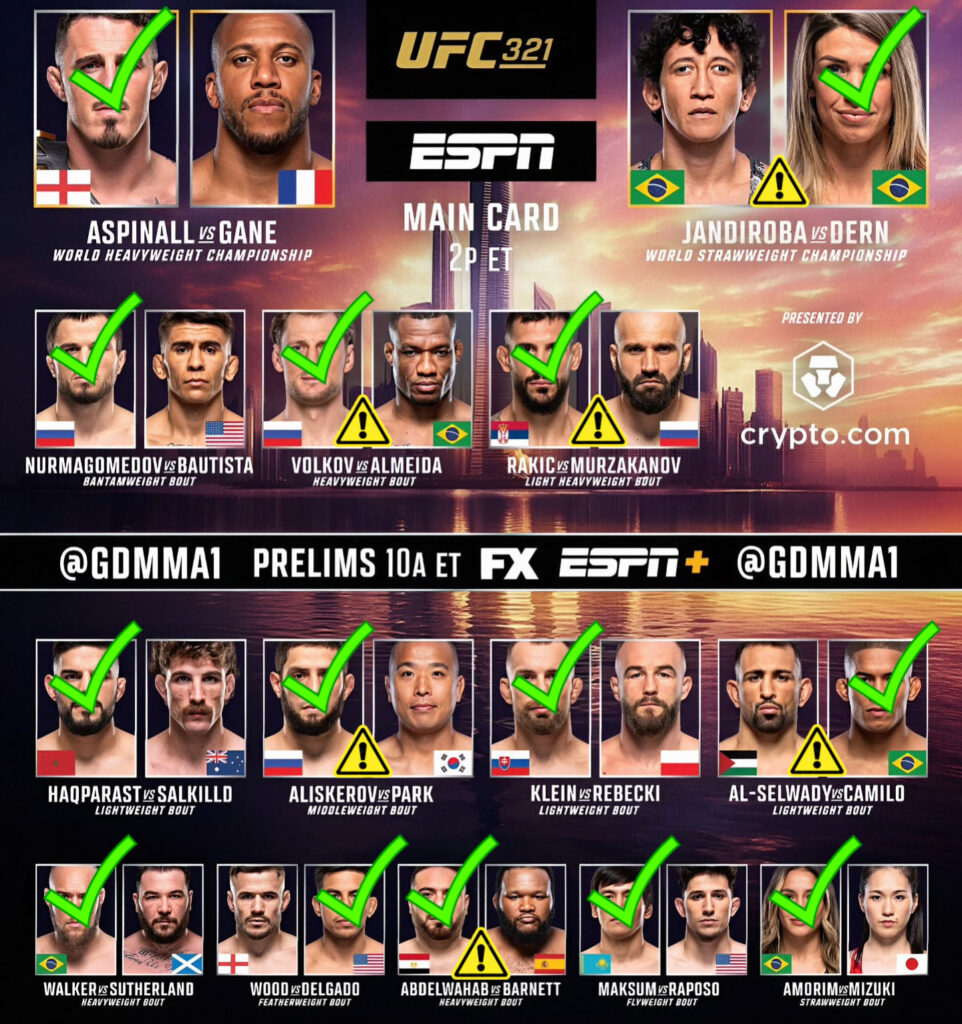 - Ciryl Gane (13-2): Viene de una victoria polémica por decisión ante Alexander Volkov; tiene 3-2 en sus últimas cinco peleas. Registra 9 finalizaciones: 6 por KO y 3 por sumisión.