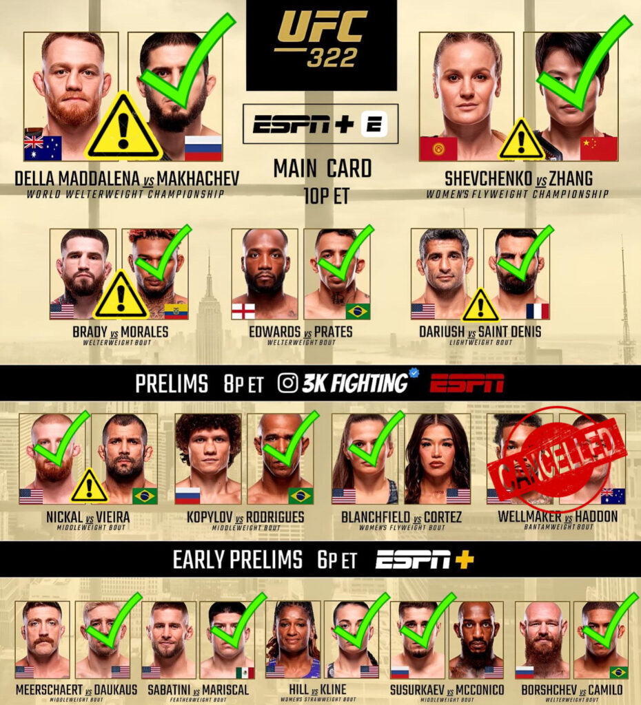 - Malcolm Wellmaker (10-0-0): Viene de victoria ante Cameron Saaiman; llega invicto con dos nocauts seguidos en UFC. Tiene 6 finalizaciones por KO y 2 por sumisión.