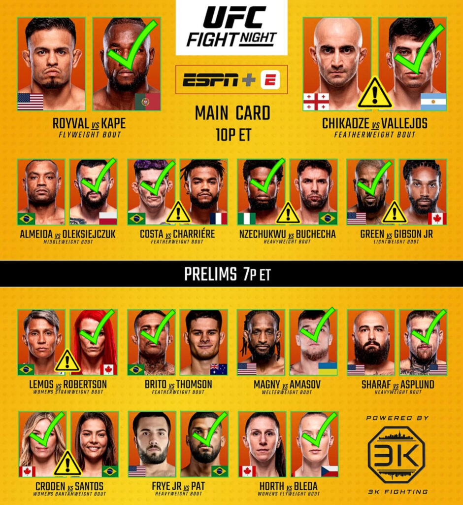 - Cesar Almeida vs. Cezary Oleksiejczuk – Menos de 1.5 rounds / Victoria por KO/TKO.