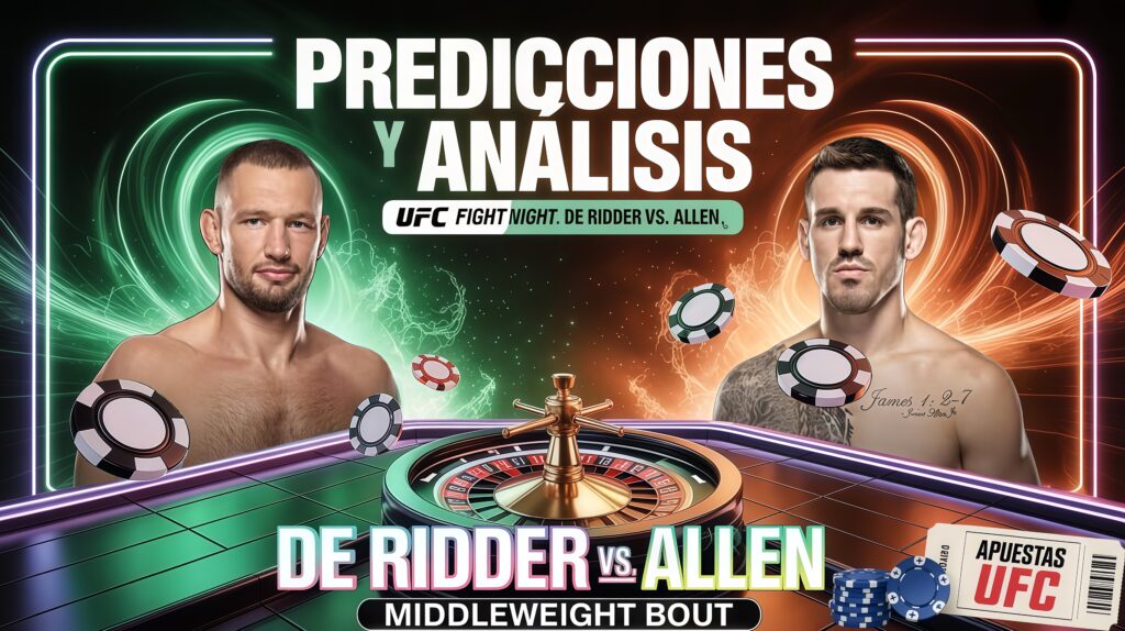 Aquí encontrarás las predicciones y análisis completos de cada pelea del evento UFC Fight Night: de Ridder vs. Allen, que se llevará a cabo el sábado 18 de octubre de 2025. Descubre los favoritos según las casas de apuestas, sus rachas recientes, los peleadores con mayores probabilidades de ganar, los posibles métodos de victoria y las predicciones más confiables. Además, conoce los parlays más seguros para obtener ganancias y proteger tu dinero 💰💵.