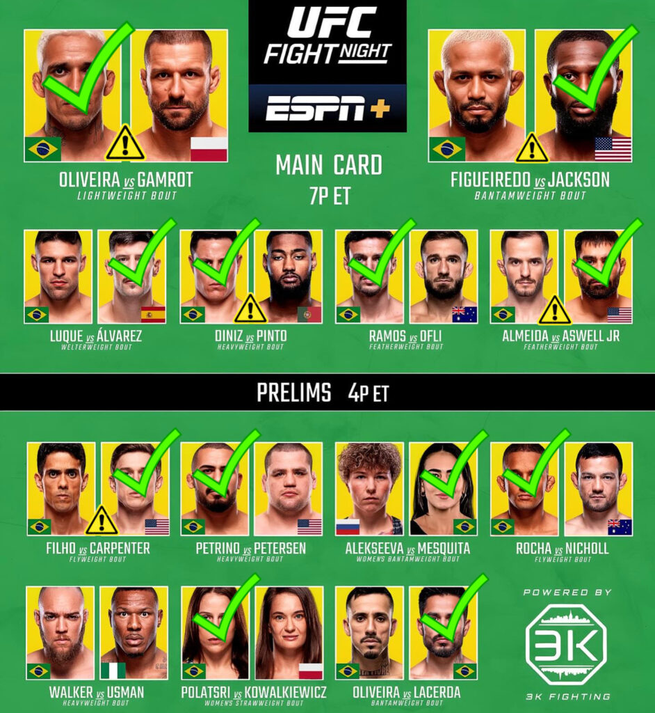 - Jhonata Diniz (9-1-0): Viene de una victoria por decisión ante Alvin Hines; tiene una racha de 3-1 en UFC. Registra 7 finalizaciones, todas por KO.
