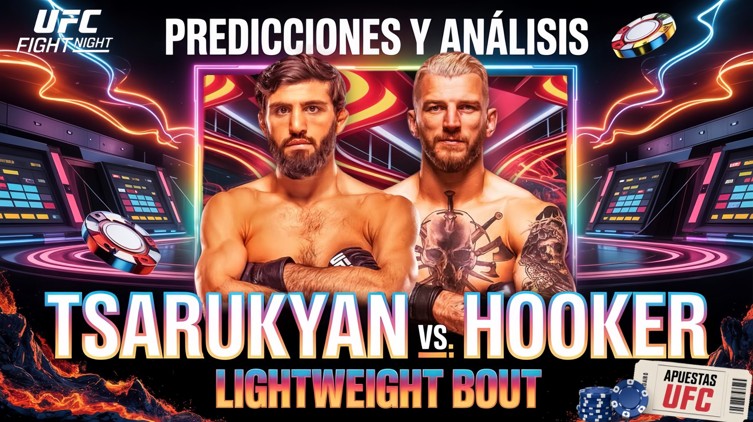 Predicciones y análisis del evento completo UFC Fight Night: Tsarukyan vs. Hooker, que se celebrará el sábado 22 de noviembre de 2025 en el ABHA Arena (Ali Bin Hamad Al-Attiyah Arena) de Doha, Qatar. Conoce a los favoritos según las casas de apuestas, sus rachas recientes, los peleadores con mayor probabilidad de victoria y los métodos de triunfo más probables. Además, descubre las predicciones más confiables, los parlays recomendados y las apuestas más seguras para obtener ganancias y proteger tu dinero.