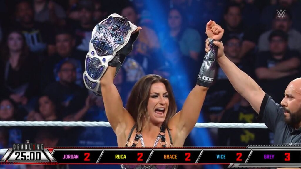 Lola combina patadas al estilo Naomi, hip attacks, un doble German suplex y busca múltiples coberturas. Grey, mientras tanto, atrapa a Grace en un cross arm breaker y consigue su segunda caída.