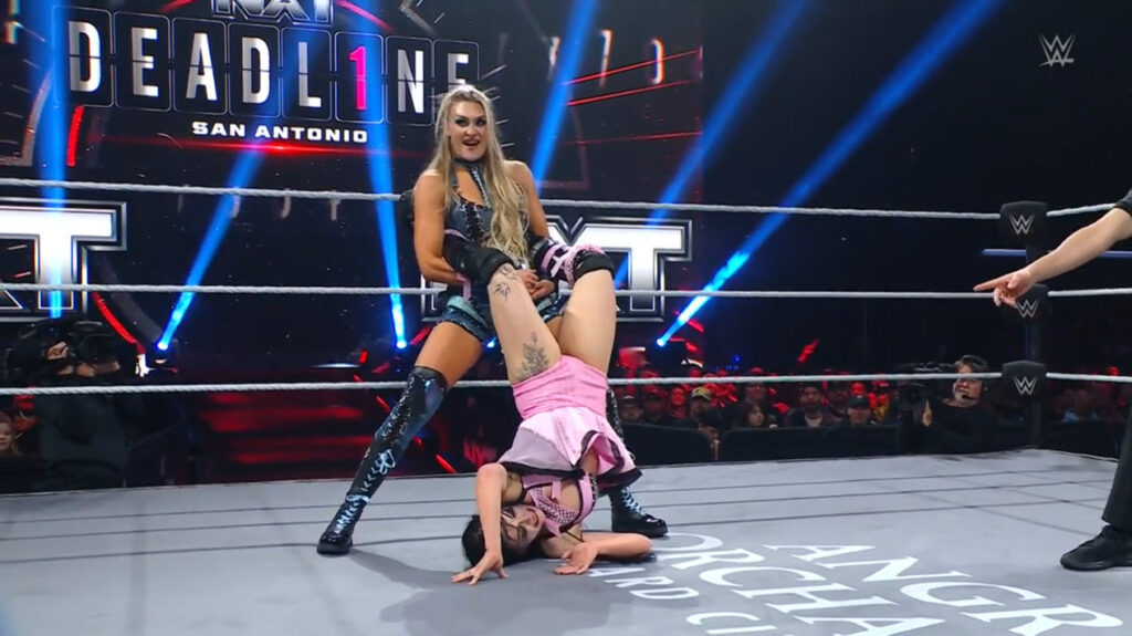 Niko y Shawn Spears intentan entrar antes del inicio, pero el árbitro los manda a backstage. Izzi Dame busca atacar por la espalda, pero Tatum Paxley la descubre y la campana suena. Izzi intenta desconcentrarla, aunque Tatum responde con antebrazos fuertes hasta que Izzi la frena con un lazo al cuello.